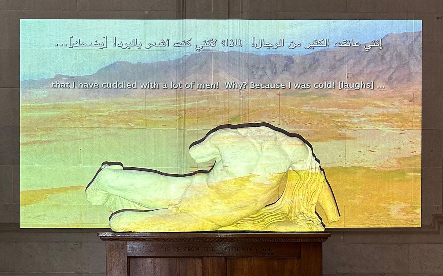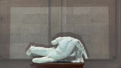 Installation view of Untethered (2024) in the main court at Maryland Institute College of Art, Baltimore, MD, USA. Decommissioned, model T-10, U.S. military personnel parachute with severed suspension lines, detached harness with risers, 550 para-cord. High-definition video projection, stereo soundtrack, 7 min 26 sec. Parachute diameter: 35 feet. Harness dimensions: 30 x 30 inches (excluding suspension lines)